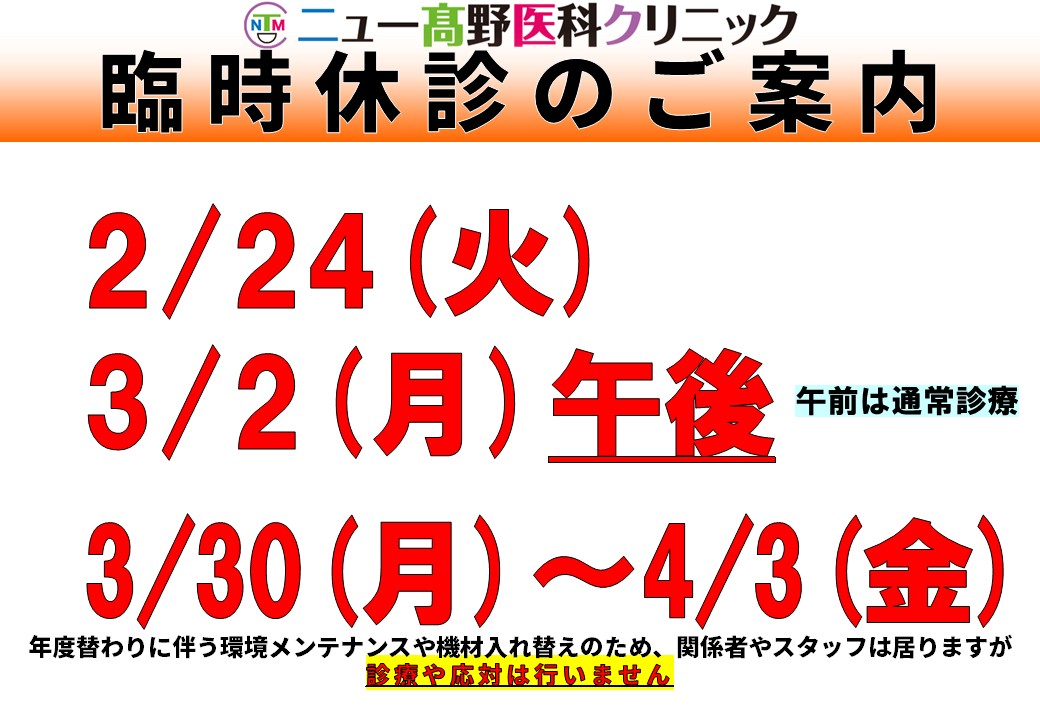 🆕⛔【臨時休診】2/24(火)、3/2(月)午後、3/30(月)~4/3(金)