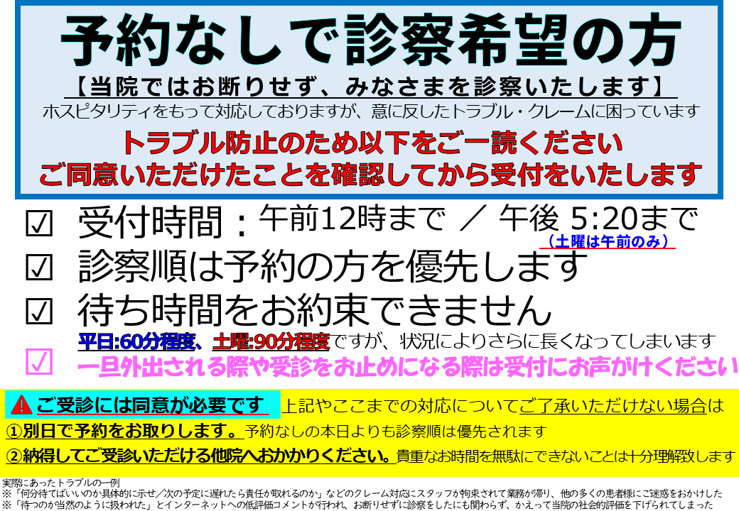 ※「何分待てばいいのか具体的に示せ」「次の予定に遅れたら責任が取れるのか」などのクレーム対応にスタッフが拘束されて業務が滞り、他の多くの患者様にご迷惑をおかけした